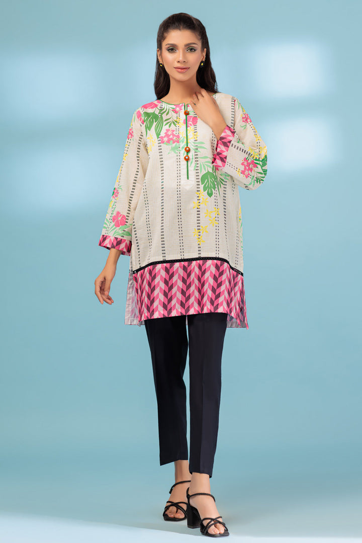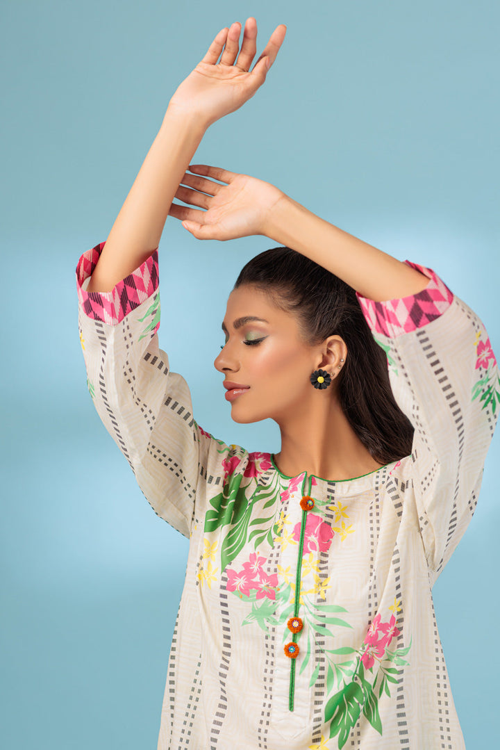 Digital Printed Lawn Shirt With Accessories On Front, Centre With Lace At Bottom Hem.