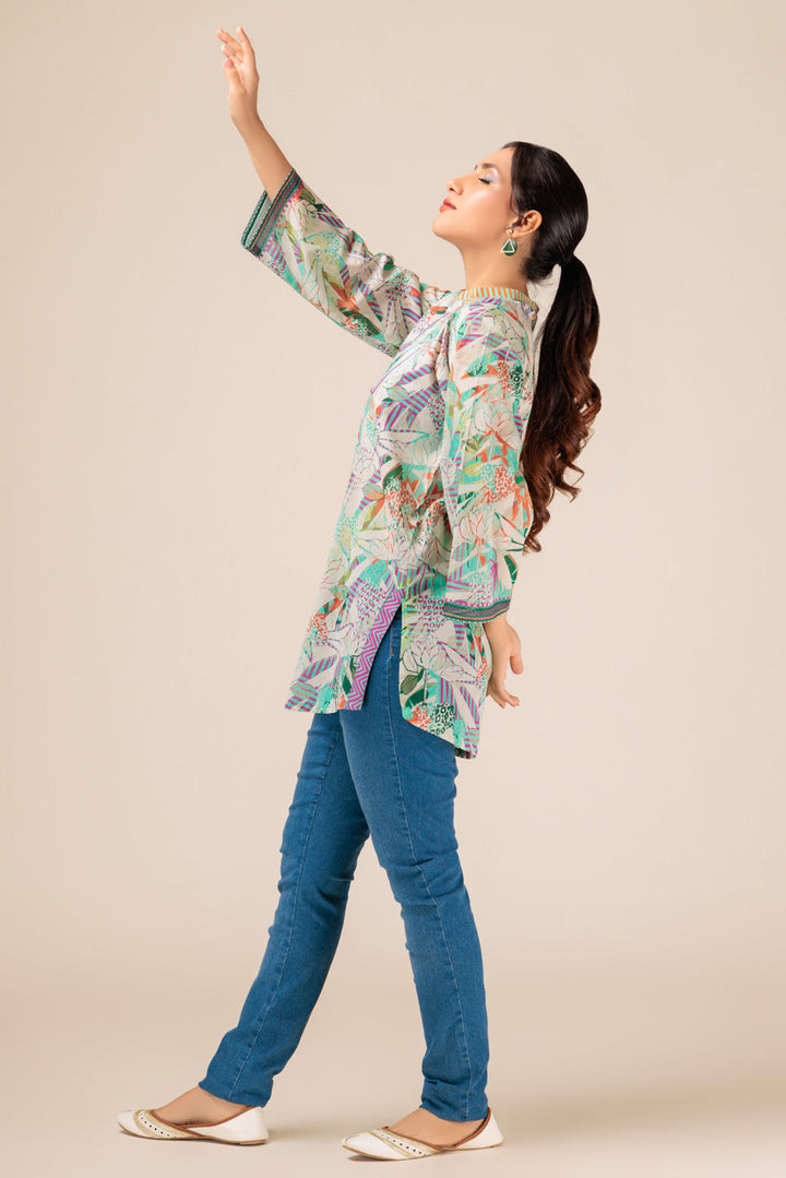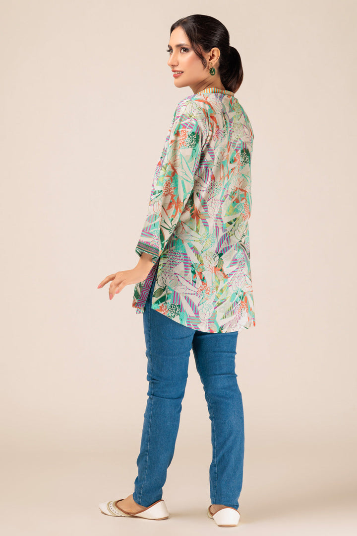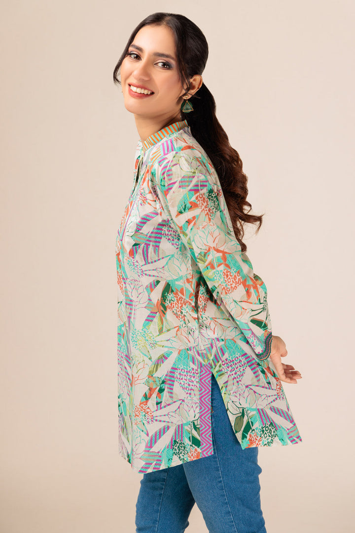 Digital Printed Lawn Loose Fit Shirt With Band Collar And Button On Front.