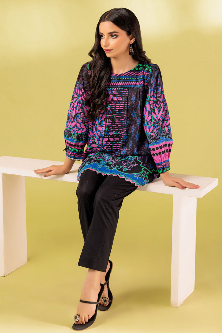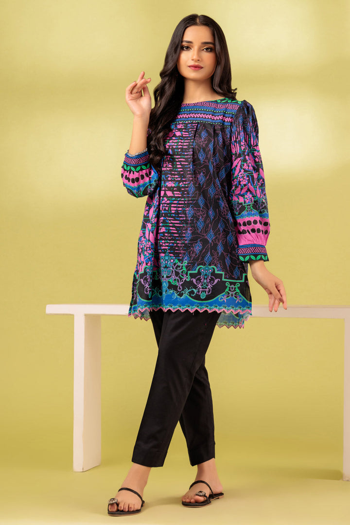 Digital Printed Lawn Shirt With Boat Neck ,Balloon Sleeves With Cuffs And Cutwork On Hem.