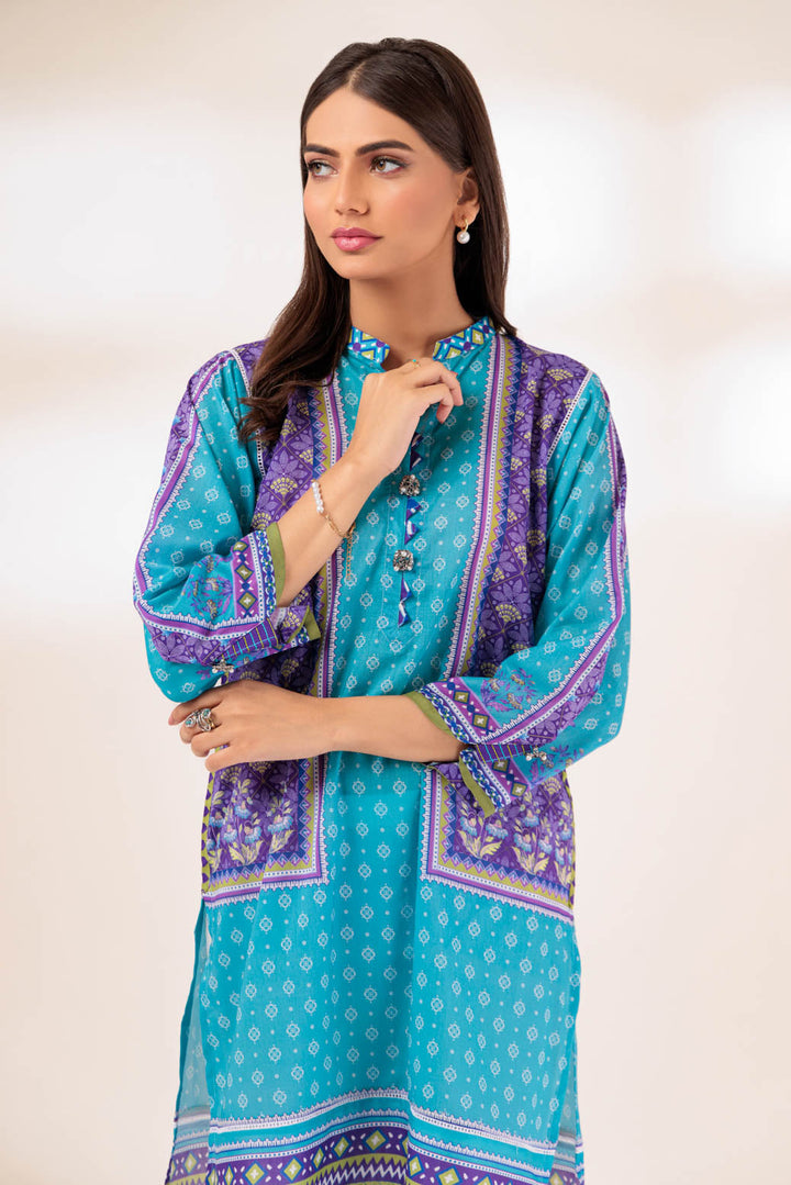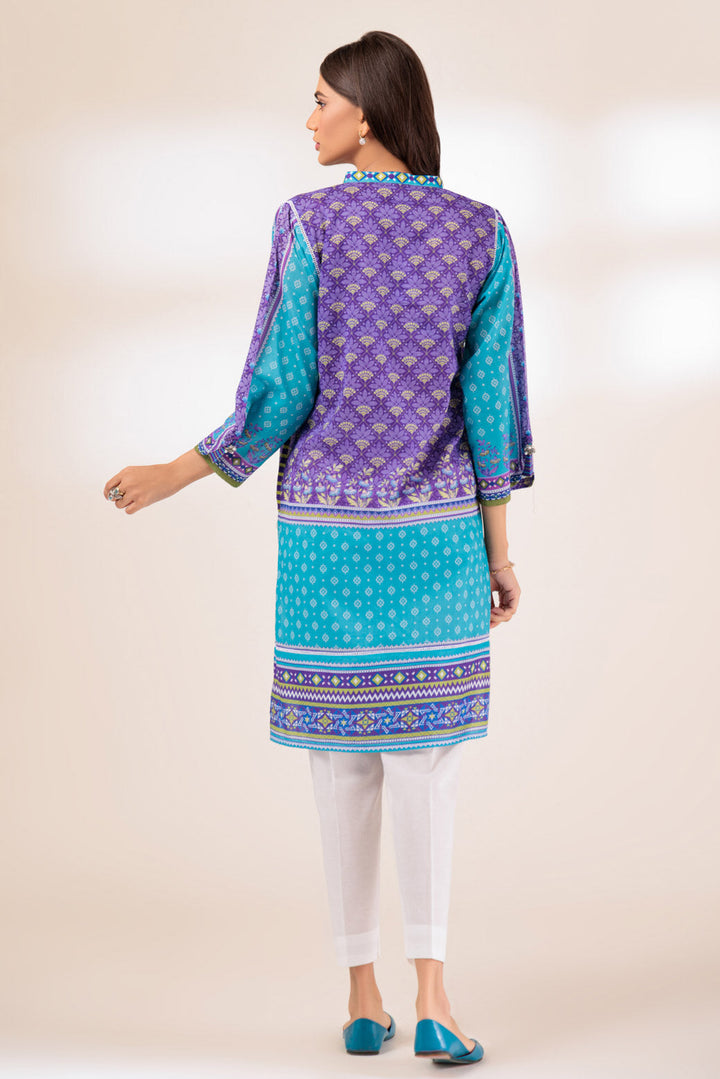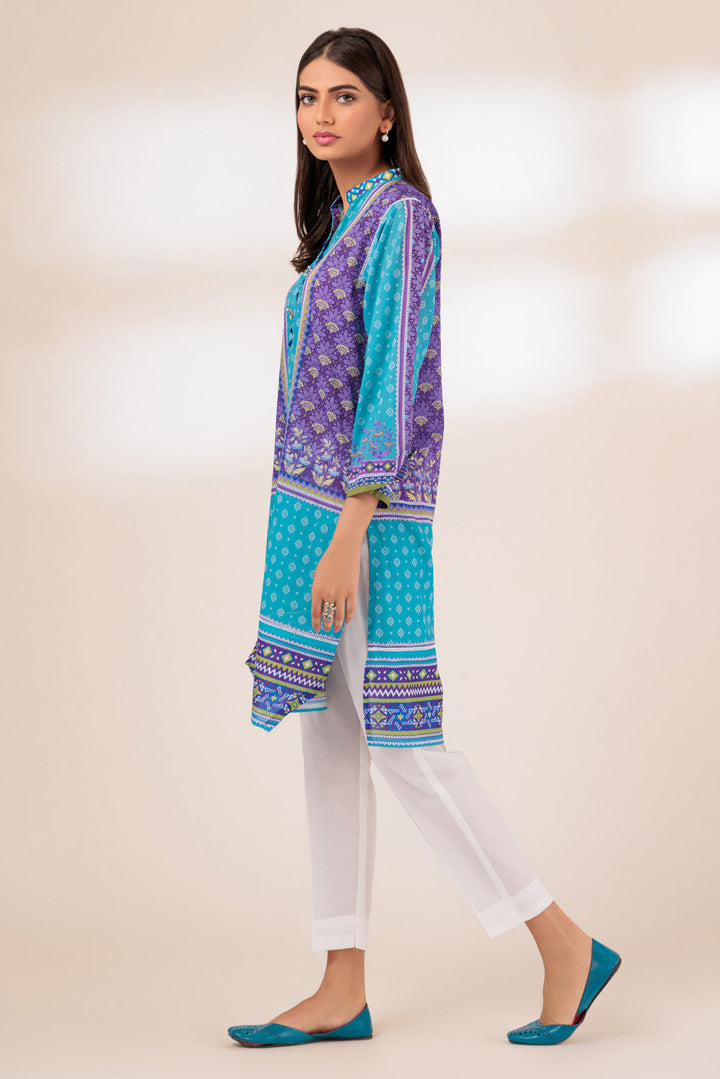 Digital Printed Lawn Kurti With Band Collar With Embellishment On Neckline.