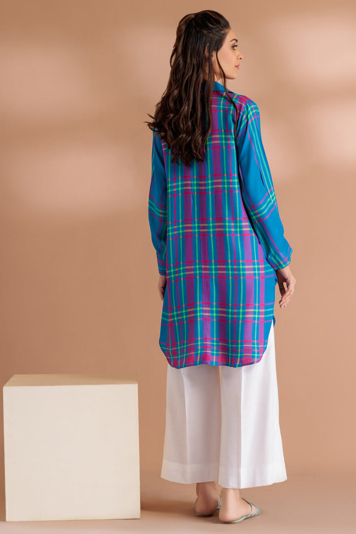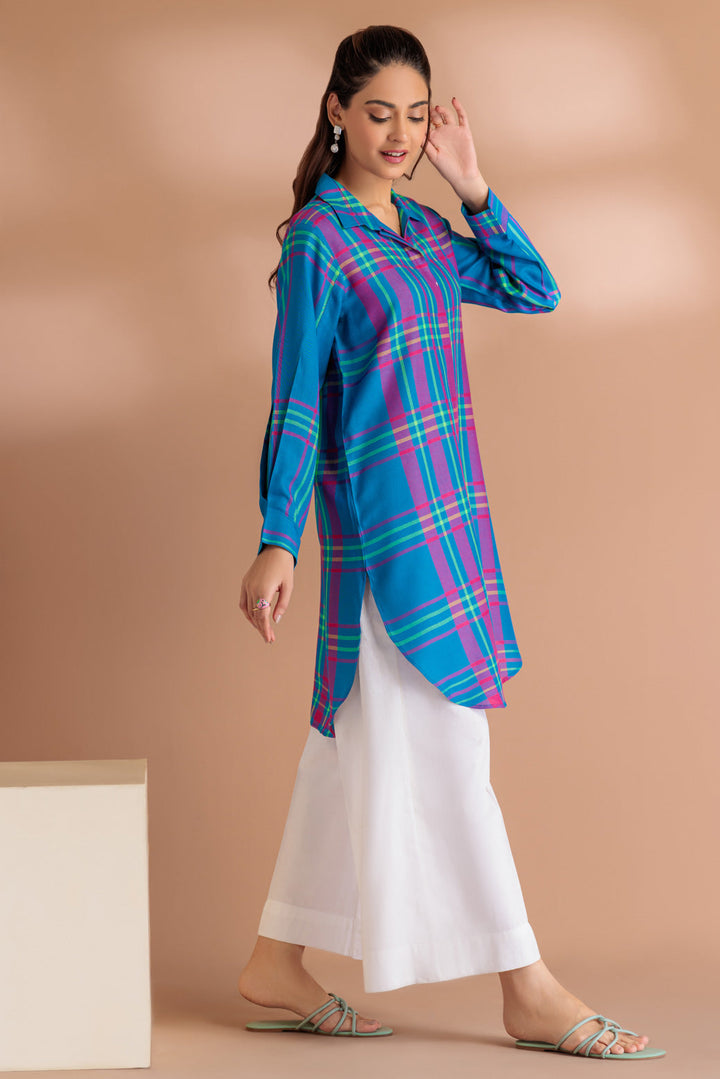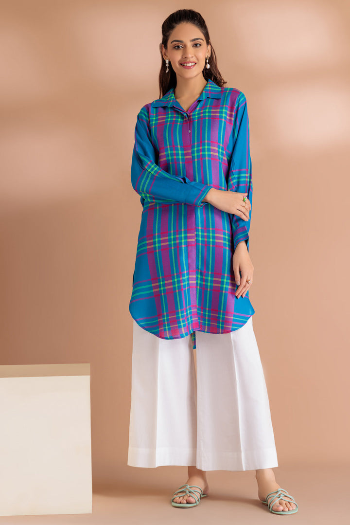 Yarn Dyed Shirt Button Dawn Loose Fit Long Tunic With Shirt Collar And Cuffed Sleeves.